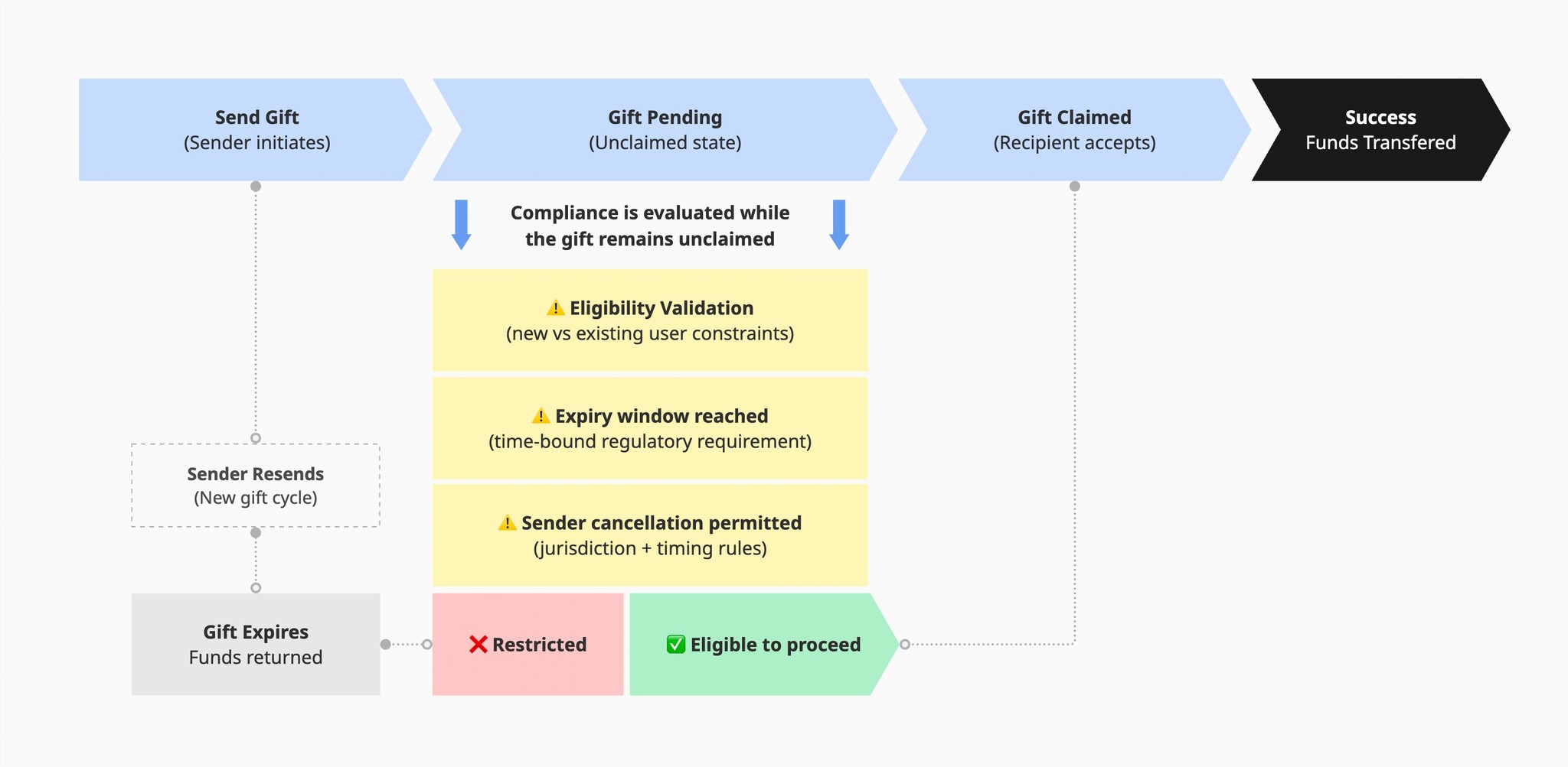 The gifting flow was designed around explicit system states (sent, pending, claimed, expired), with eligibility, expiry, and cancellation rules continuously evaluated during the unclaimed state. This allowed regulatory requirements to be enforced without interrupting the primary send-and-claim experience.