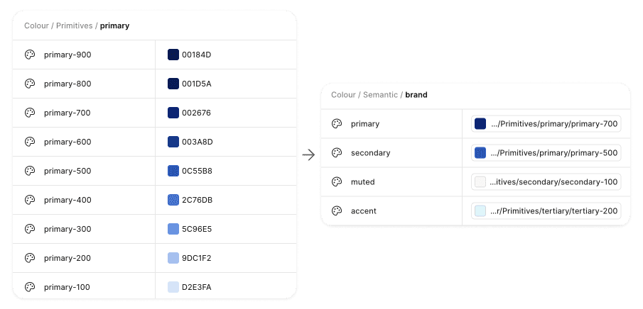 Semantic tokens reference primitive scales, enabling brand theming without refactoring components.